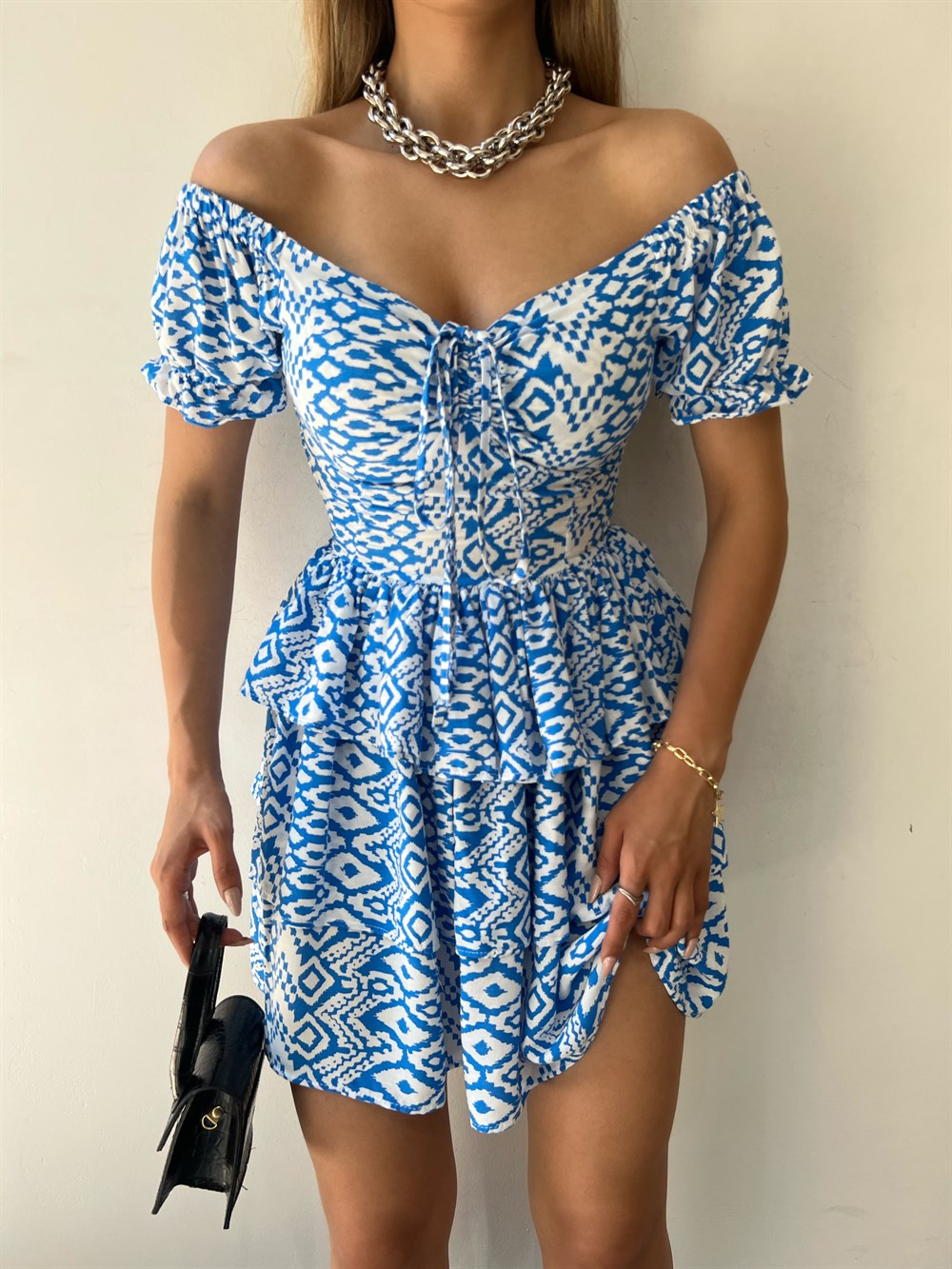 Ön Tünelli Katlı Desenli Elbise 9588 MAVİ