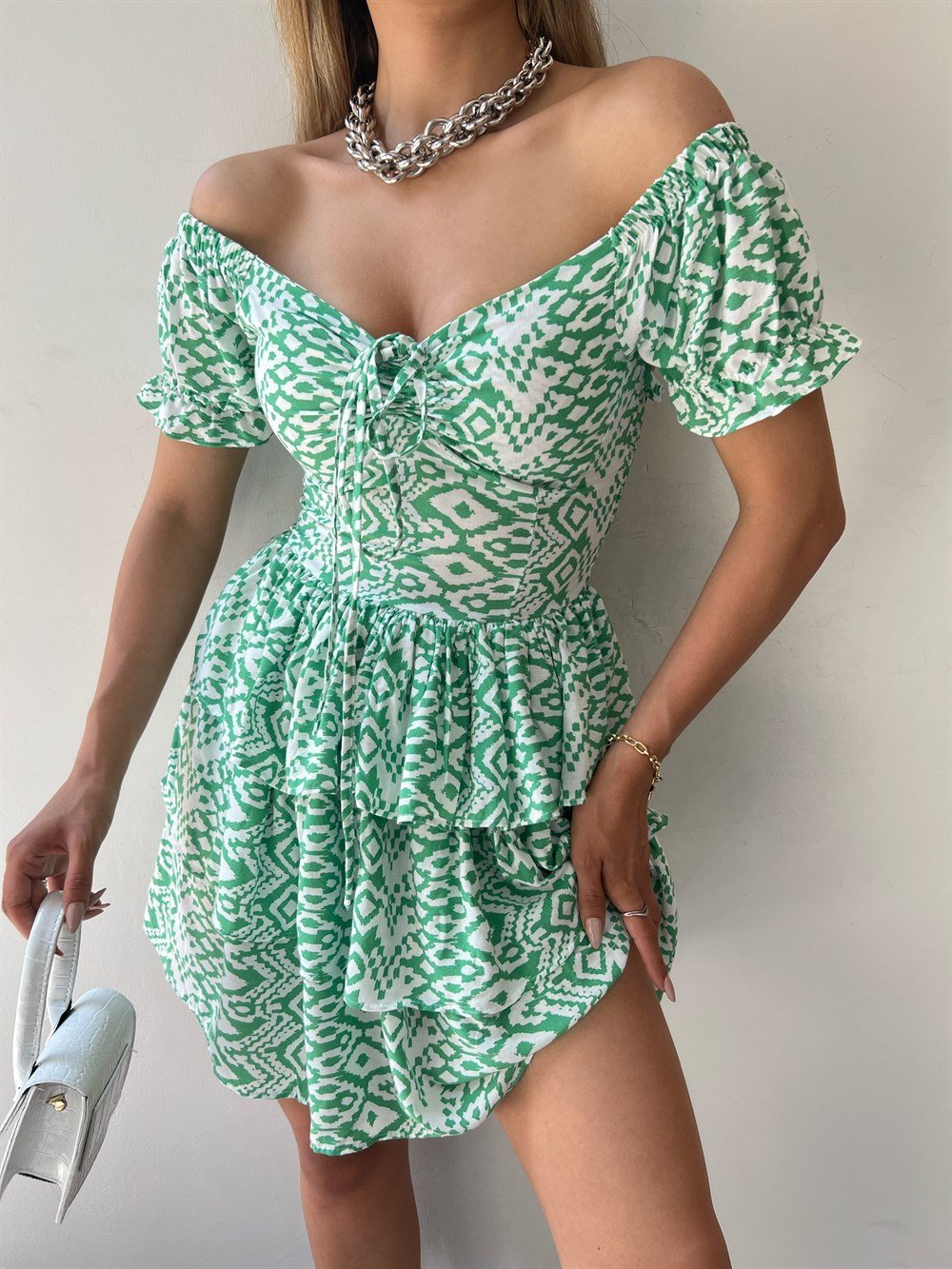 Ön Tünelli Katlı Desenli Elbise 9588 YEŞİL