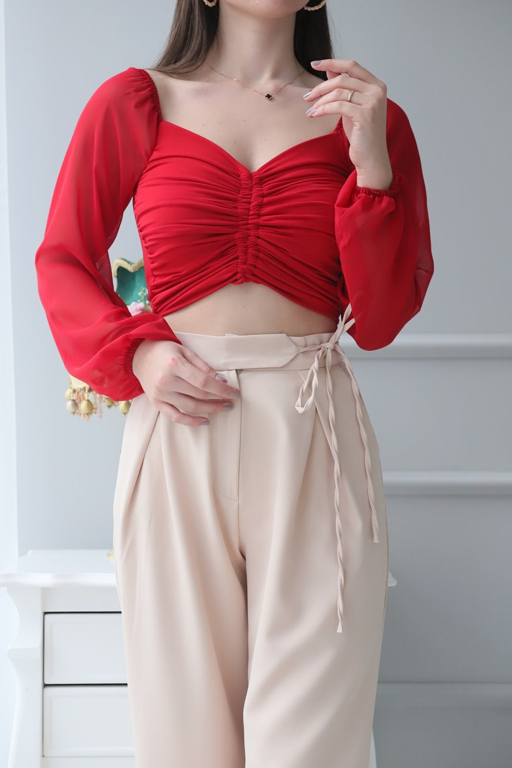 Önü Büzgülü Tüllü Bluz KIRMIZI