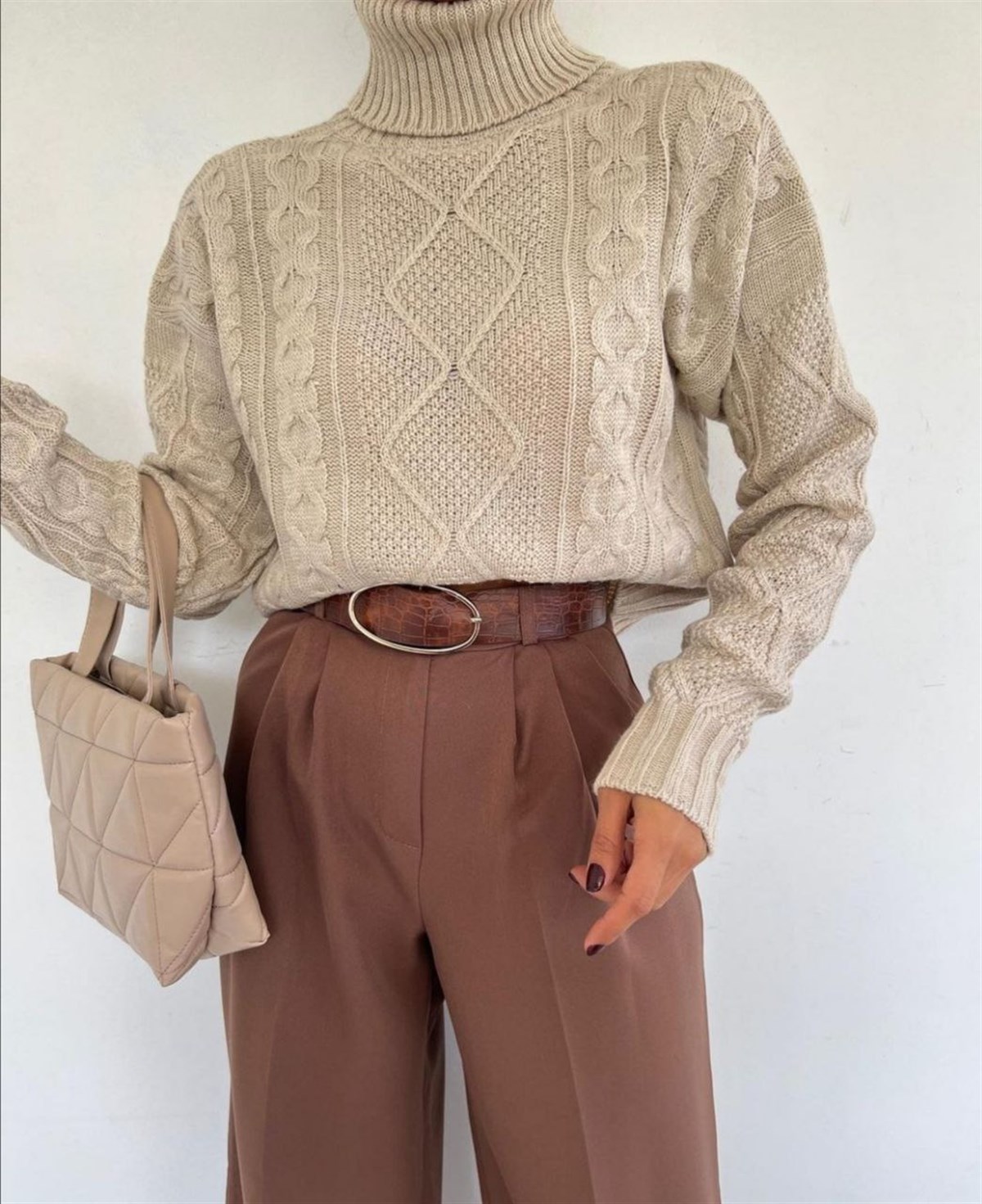Örgü Desenli Boğazlı Kazak 9633 TAŞ