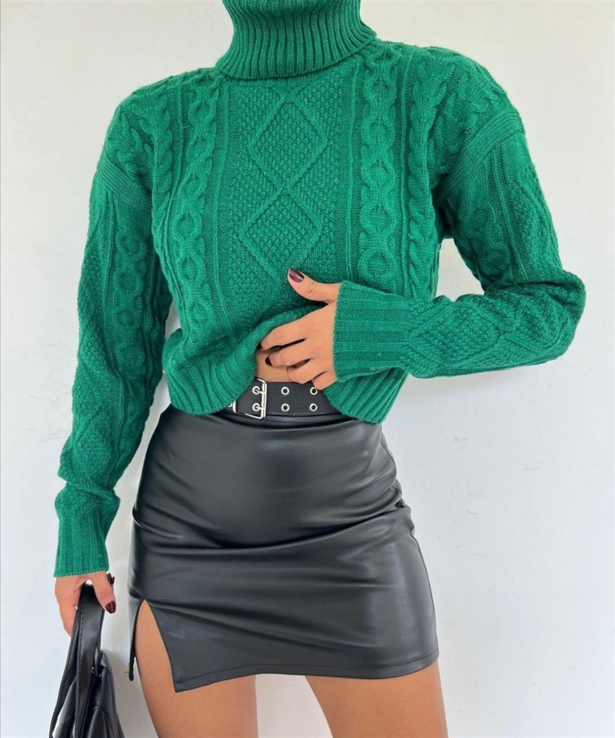 Örgü Desenli Boğazlı Kazak 9633 YEŞİL