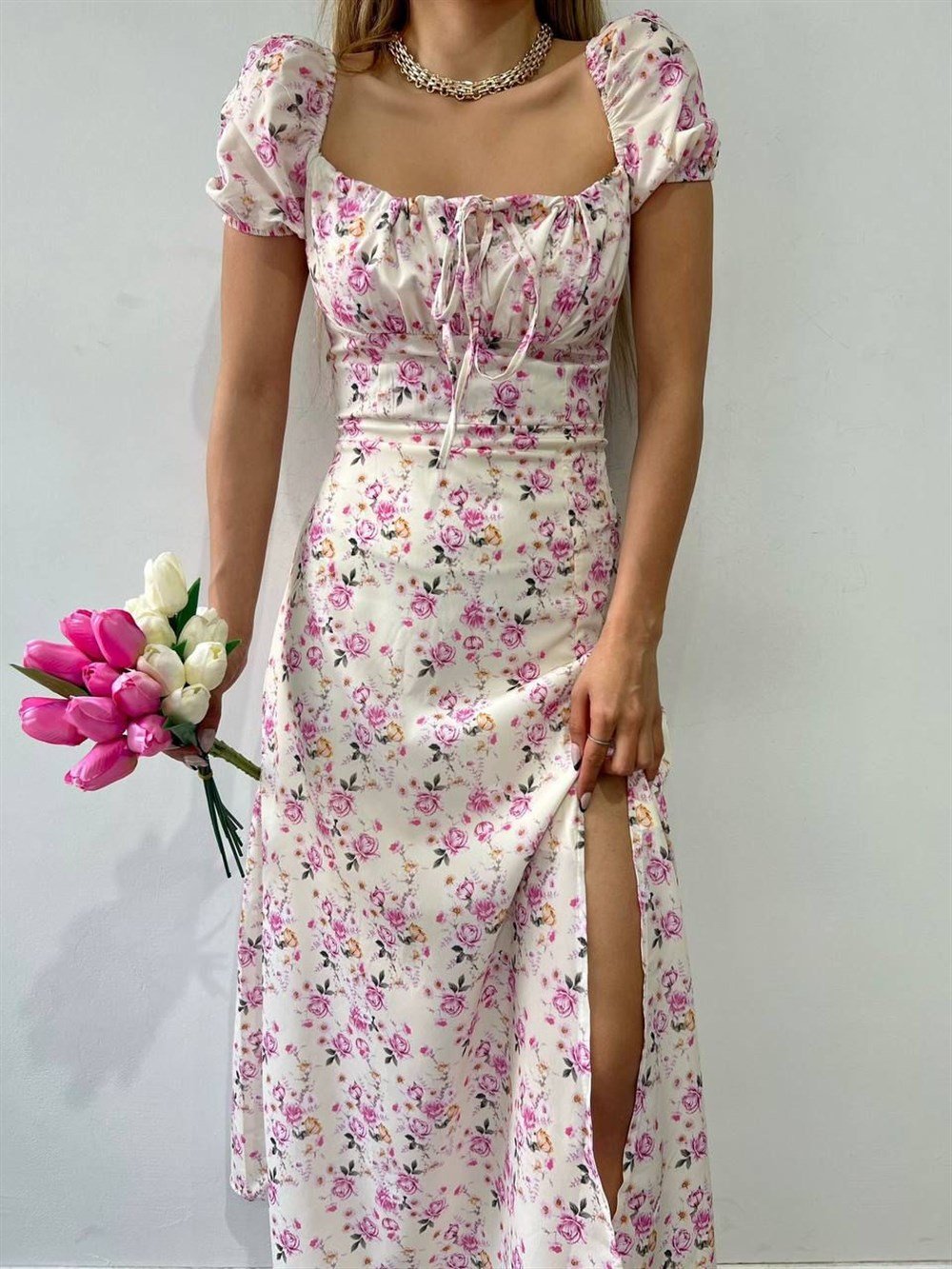 Paris Çiçek Desen Yırtmaçlı Midi Boy Elbise KREM