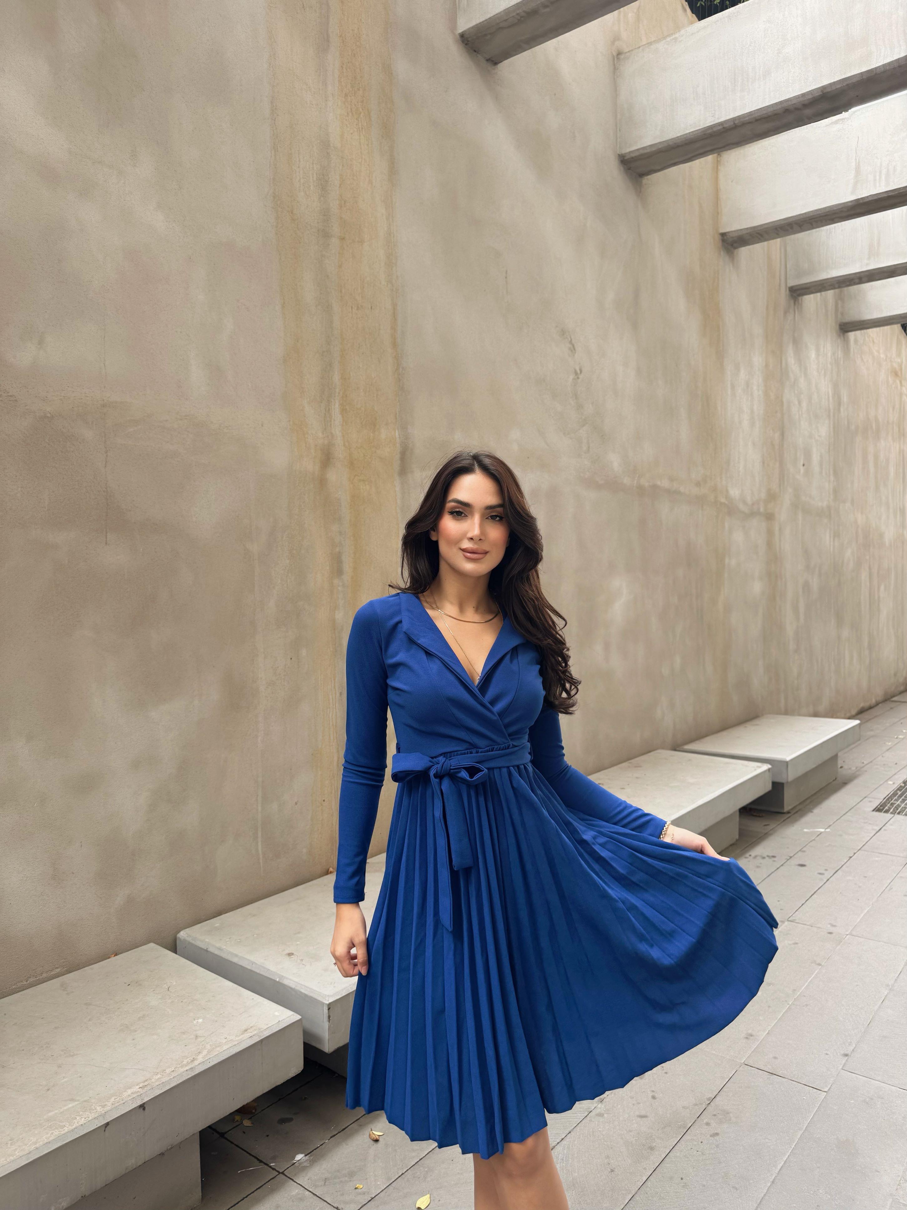 Paul Kruvaze Yaka Pliseli Midi Elbise 582259 SAKS MAVİSİ