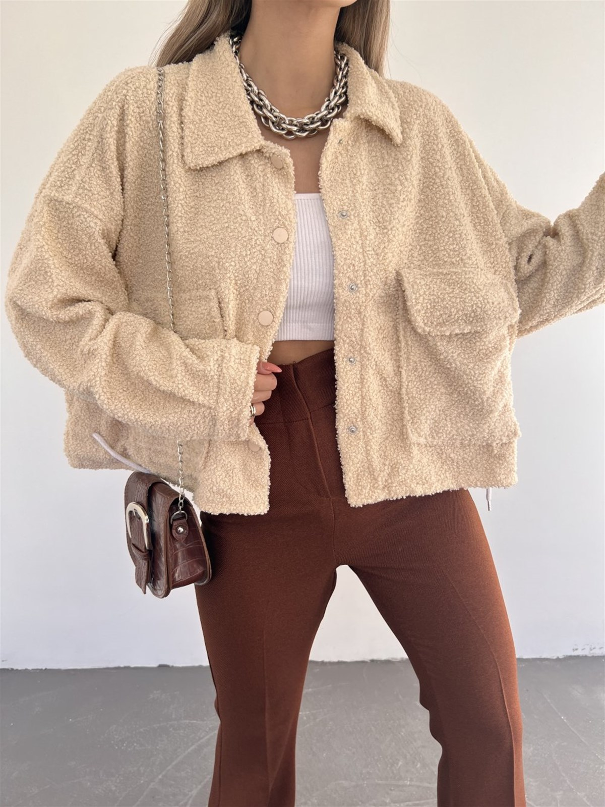 Peluş Cepli Crop Ceket 8110 TAŞ