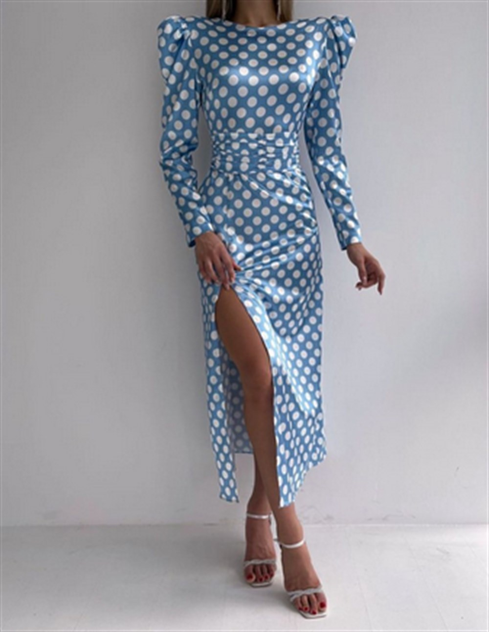 Puantiyeli Saten Elbise- 4033 MAVİ