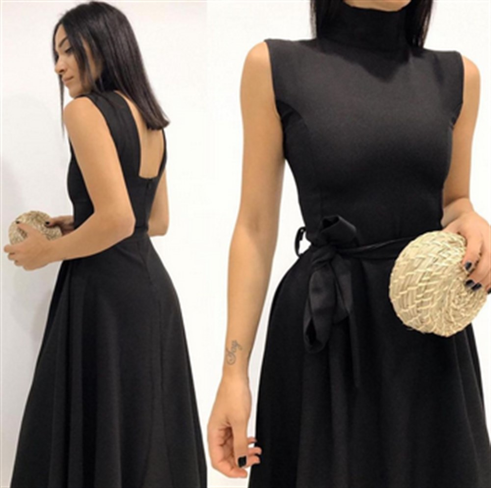 Sırt Dekolte Kuşaklı Maxi Elbise- 1616