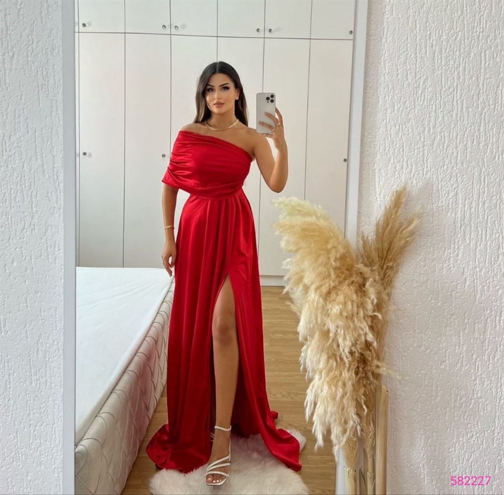 Twis Tek Omuz Yırtmaç Detay Saten Abiye 58227 KIRMIZI