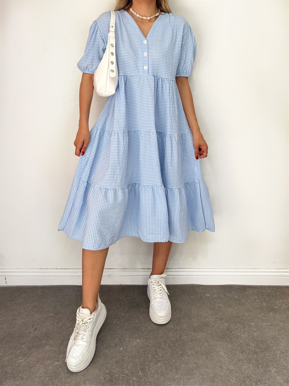 Üç Katlı Pötikare Gofre Elbise 2726 MAVİ