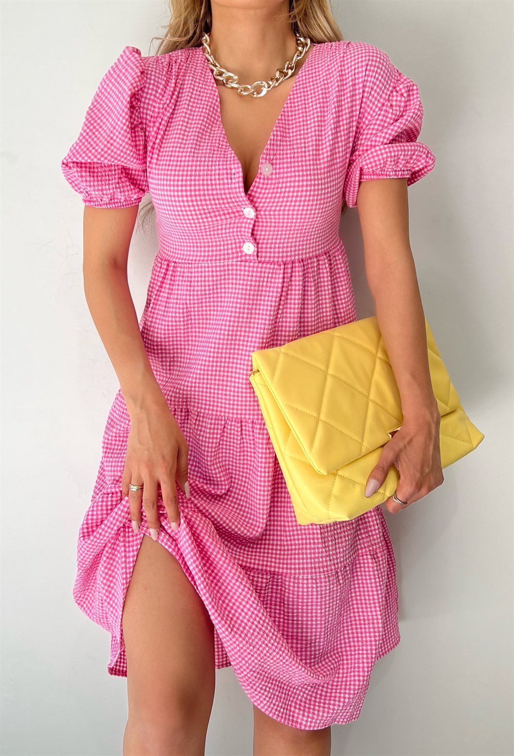 Üç Katlı Pötikare Gofre Elbise 2726 PEMBE