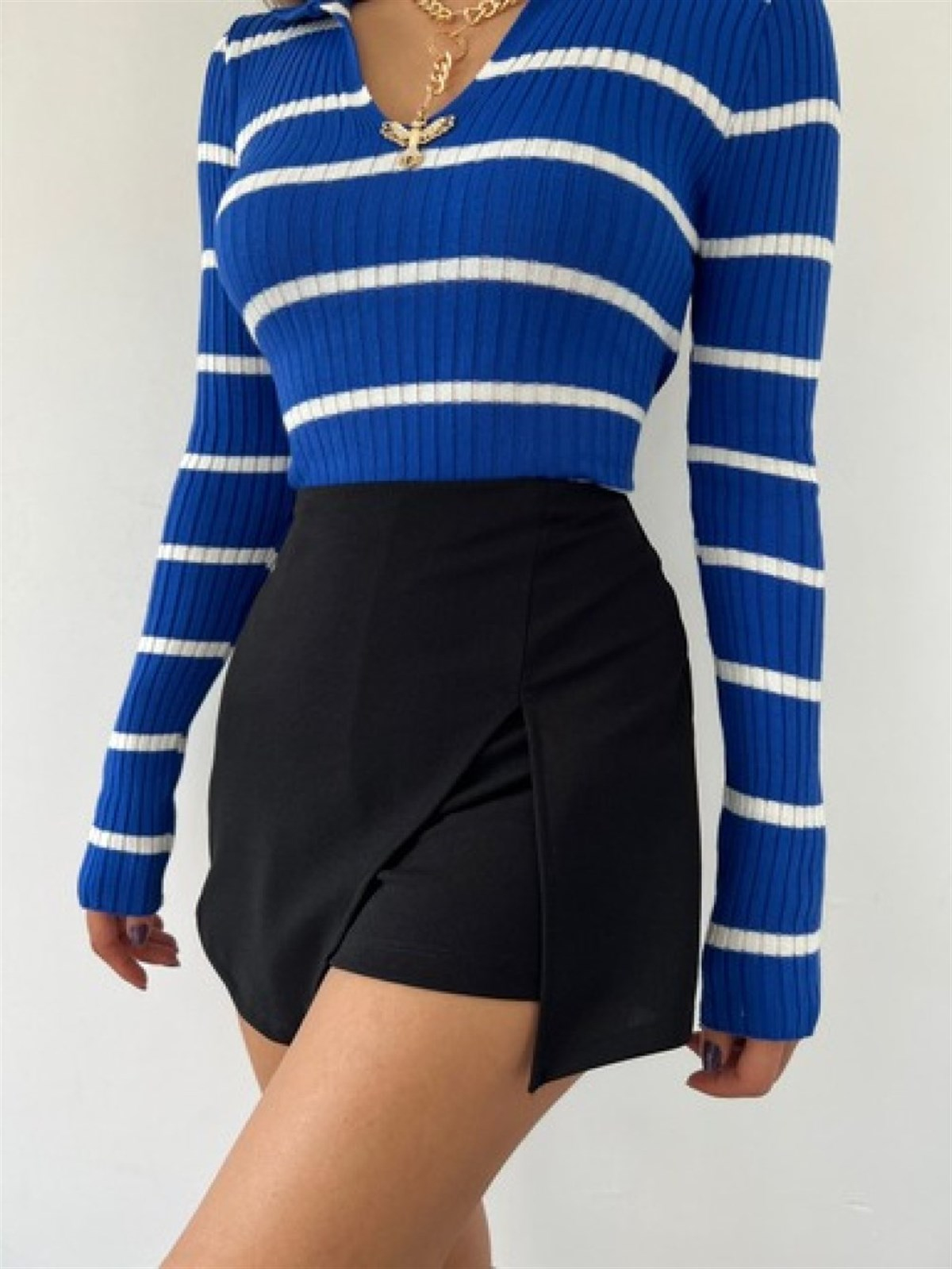 V Yaka Çizgili Triko Kazak 0025 Mavi