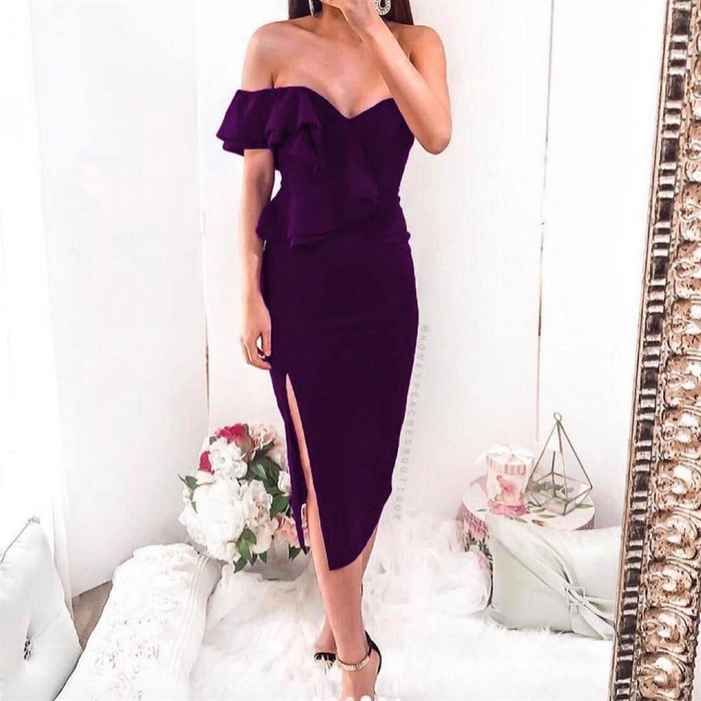 Volan Detay Yan Yırtmaçlı Elbise MÜRDÜM