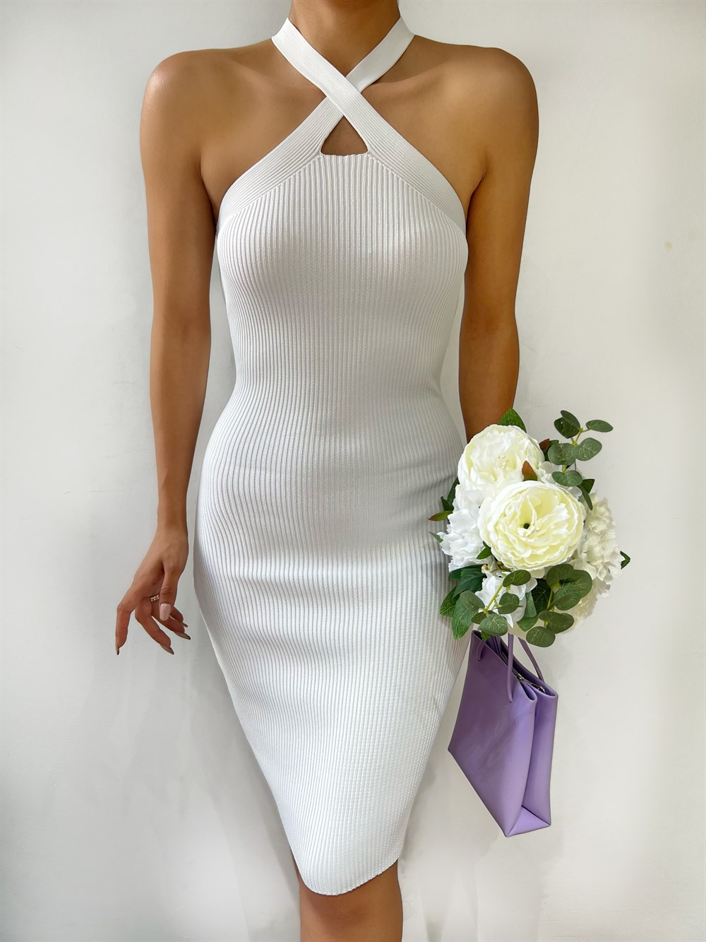 Yaka Detay Çapraz Askılı Elbise BEYAZ
