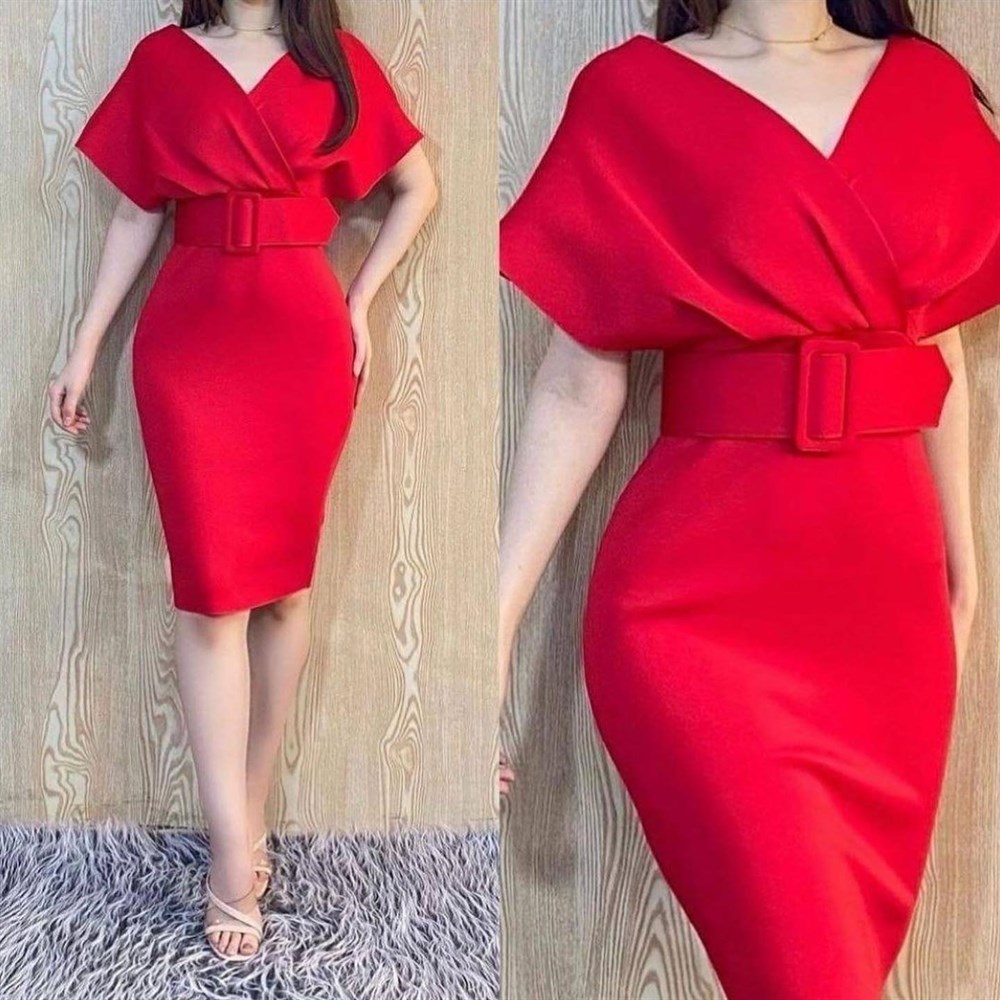 Yaka Detay Kemerli Elbise KIRMIZI