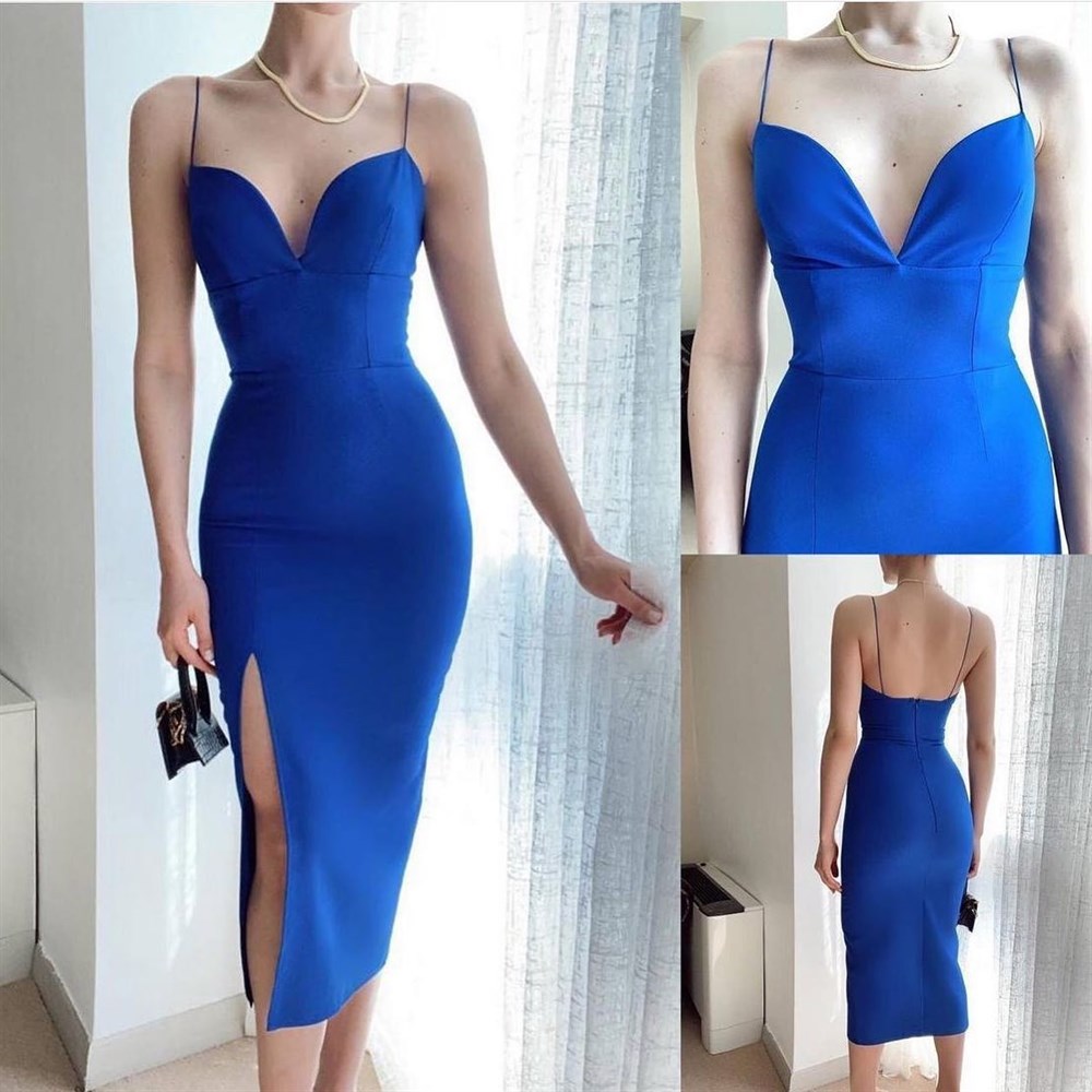 Yaka Detay Yırtmaçlı Elbise SAKS MAVİSİ